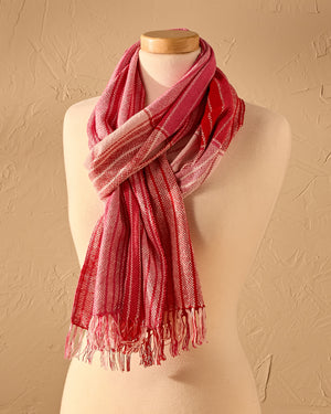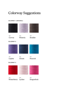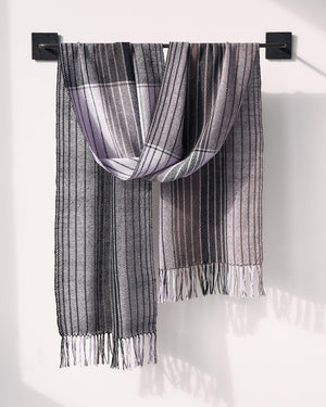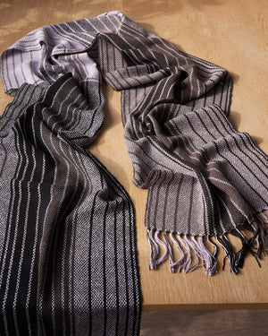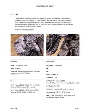 The undulating pattern throughout this silk scarf is created by pairing thick and thin warp stripes with bold weft color blocks. Three colors of Sero Silk Noil are alternated in the warp, for an unexpected combination of neutral tones and subtle hints of purple. The warp colors complemented each other so well that we could not choose just one option for the weft, so we split the decision and wove a block of each. Order a kit.