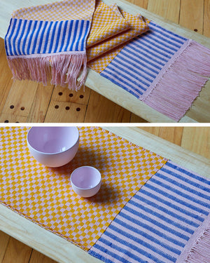 This reversible table runner is woven using a cord structure that gives the appearance of Plain Weave on one side and densely packed floats on the other. You can choose to leave this project unwashed for a graphic pattern of checks and stripes, or wash it to bring out a unique rippled texture. Order a kit.