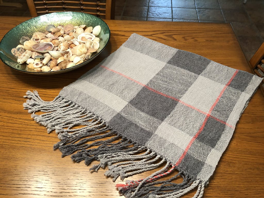 Had worked with Mallo and Duet in separate projects with success. Was curious how they would be together. They worked up beautifully in the scarf. I had a bit of pink left from a previous project so added that for a little interest. The dark grey Duet did not shrink as much as the Mallo after wet finishing so left some subtle texture, but the dark grey twisted fringe is just slightly longer than the light grey Mallo fringe.