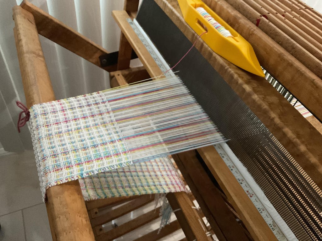 First off, thank you Gist for this free pattern that I’ve so enjoyed weaving. There was some cotton yarn in my stash that had been waiting for the right project and this was it. I wanted to make a scarf so made it 8” wide. The yarn is variegated with bright colors and it worked out perfect with this pattern, with white across the front and yellow across the back. I’m almost half way done. Love it.